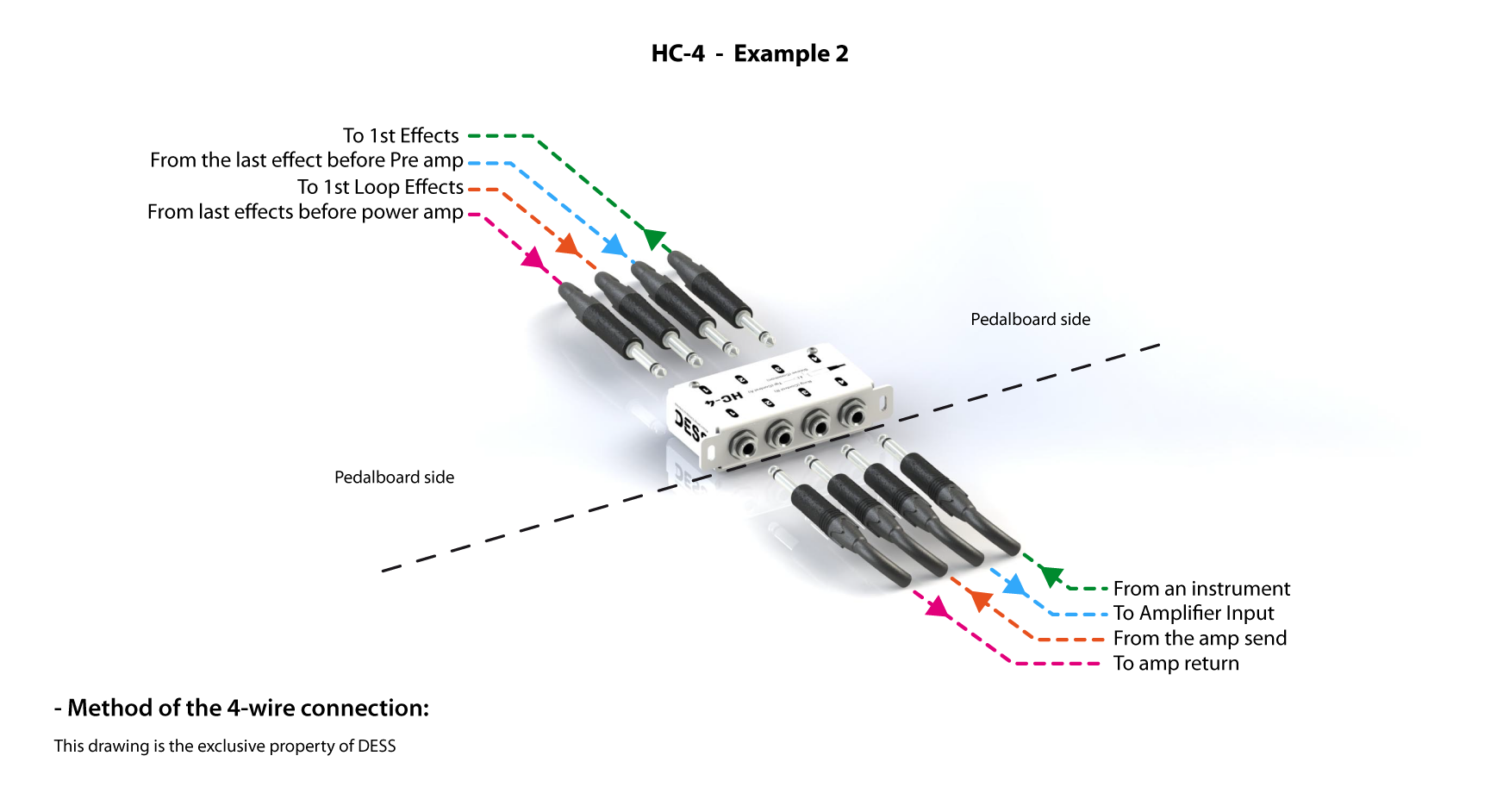 Le HC-4 est doté d'un "shunt" permettant de relier automatiquement les connecteur 2 & 3 lorsque qu'ils ne sont pas branché. Ceci a pour effet de pouvoir prévoir le branchement d'une boucle d'effets sans pour autant "décâbler" le pedalboard car "send" et "return" seront automatiquement reliée.